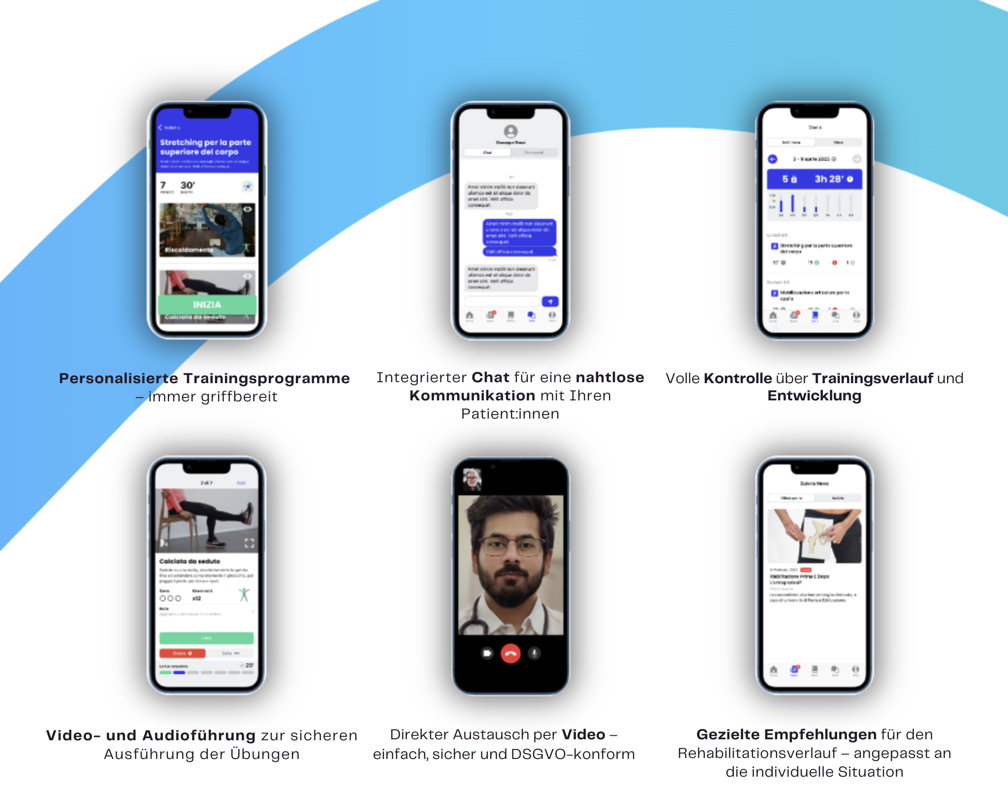 Euleria Mylinkist für iOS- und Android-Geräteverfügbar und ermöglicht es Patient:innen, das vom Fachpersonal zugewiesene Übungsprogramm oder das aerobe Outdoor-Trainingjederzeit und an jedem Ort durchzuführen.